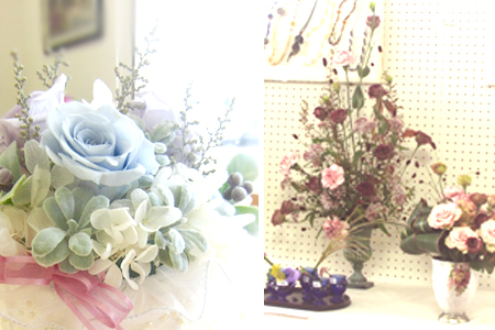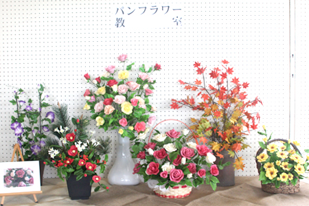 パンフラワーとは粘土で作った造花のことで、アレンジの際には花だけではなく果物や動物、人形やアクセサリーなど様々なものが作れます。粘土に絵具を混ぜ、色粘土を作り、花や葉っぱなどを作って組み立てるだけなのでかんたん!
